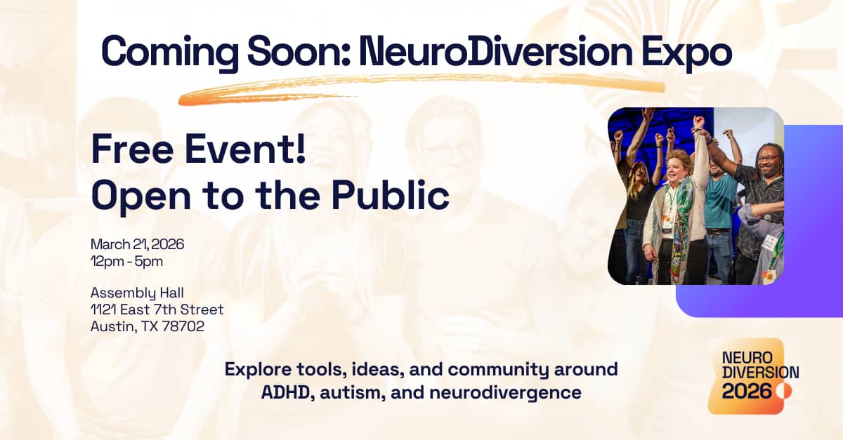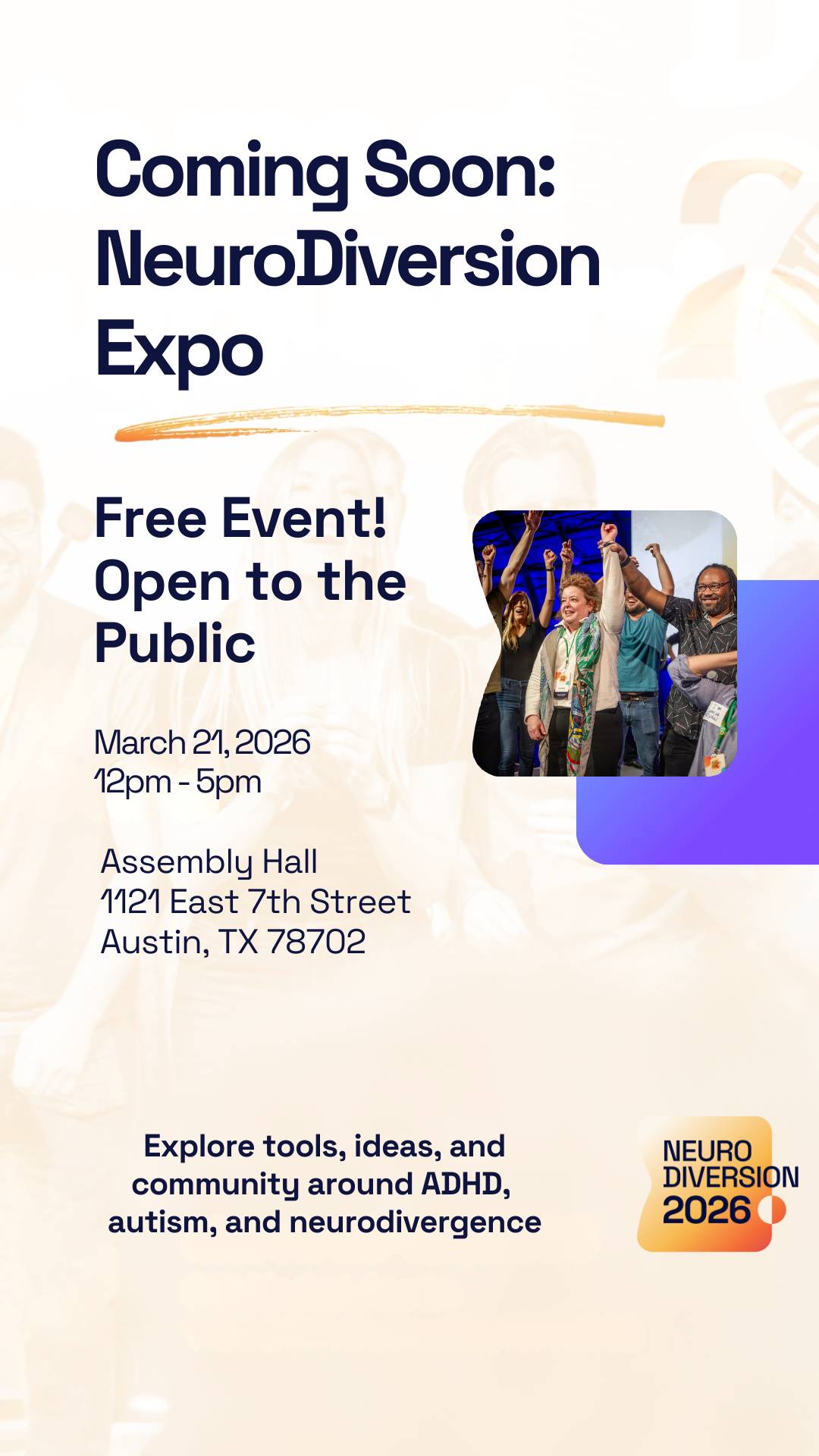 ➡️ Last Chance: NeuroDiversion Tickets Almost Gone Hey there, This is it—we're down to the final 15 tickets for NeuroDiversion 2026. If you've been thinking about joining us in Austin next month, now's the time to make your decision. What You're Getting Three days where you don't have to mask, explain yourself, or apologize for how your brain works: 50+ speakers and sessions including Tiffany Yu, Scott Barry Kaufman, Haley Honeyman, Jessica McCabe, and more Four powerful main stage gatherings...